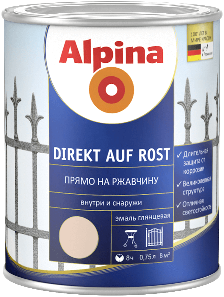 Эмаль алкидно-уретановая ALPINA по ржавчине 3 в 1 (0,75 л) - антикоррозионная эмаль для поверхностей из черных металлов с возможностью нанесения на оцинкованную поверхность. Содержит высокоэффективные ингибиторы коррозии. Подходит для внутренних и наружных работ. Обеспечивает длительную защиту от ржавчины с сохранением декоративных свойств при эксплуатации.