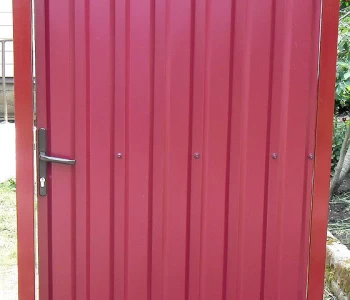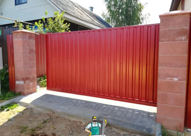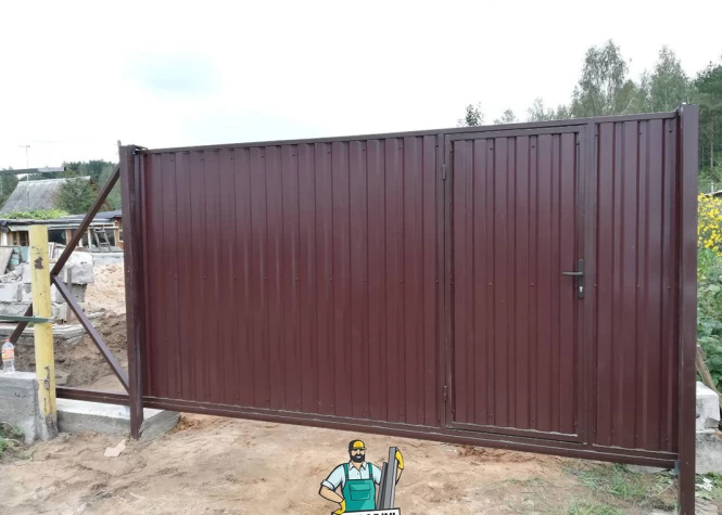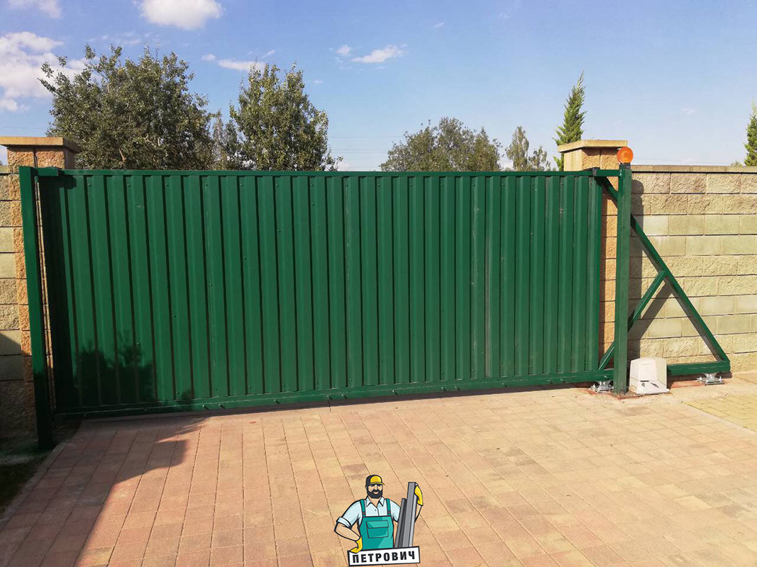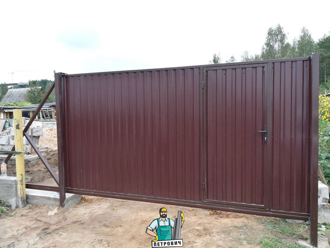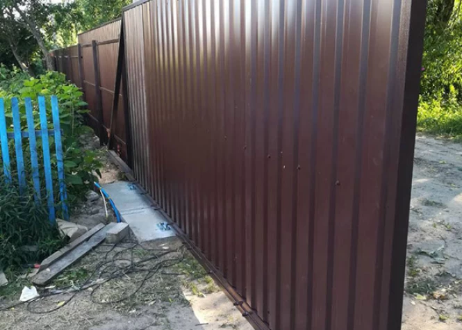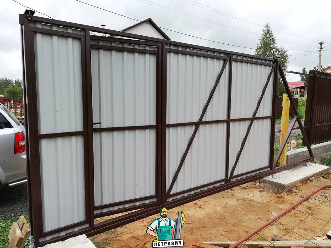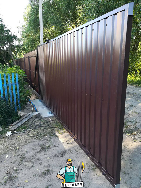 Откатные (сдвижные) ворота из профнастила- наиболее популярный вид откатных ворот. В зависимости от заполнения они могут подразделяться на: откатные ворота из профнастила с односторонним заполнением и откатные ворота из профнастила с двухсторонним заполнением.