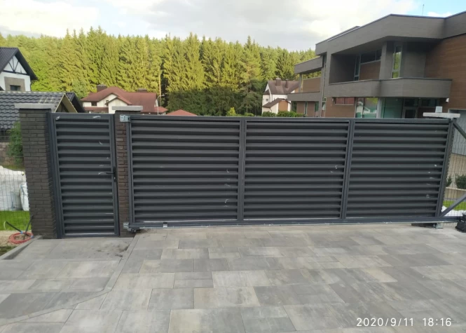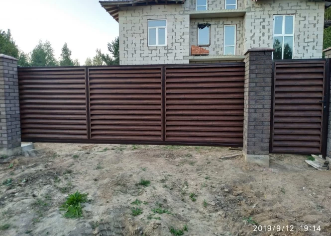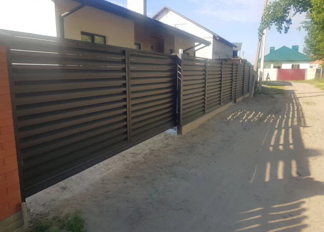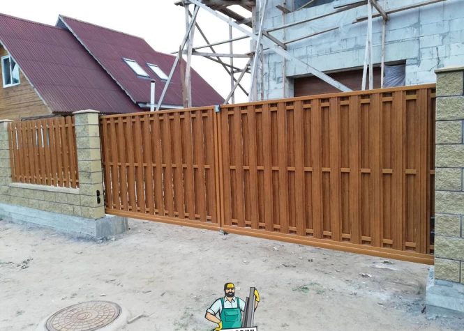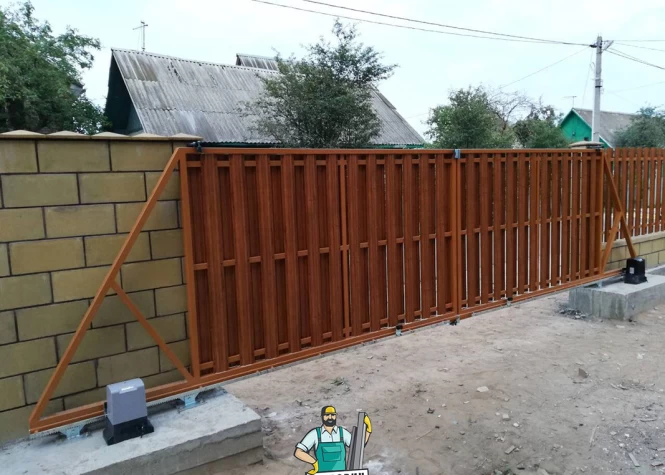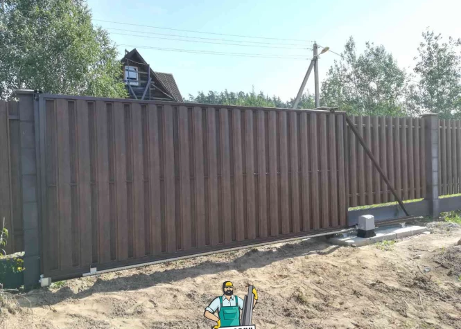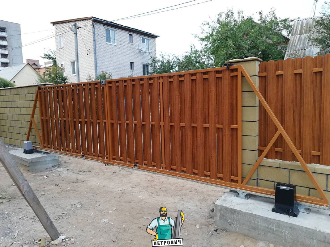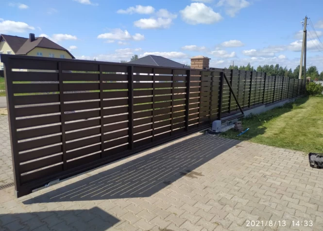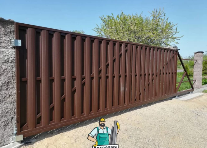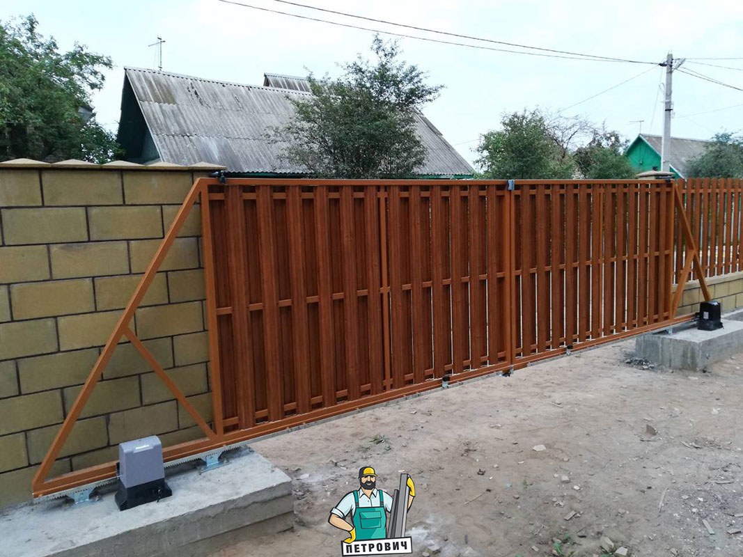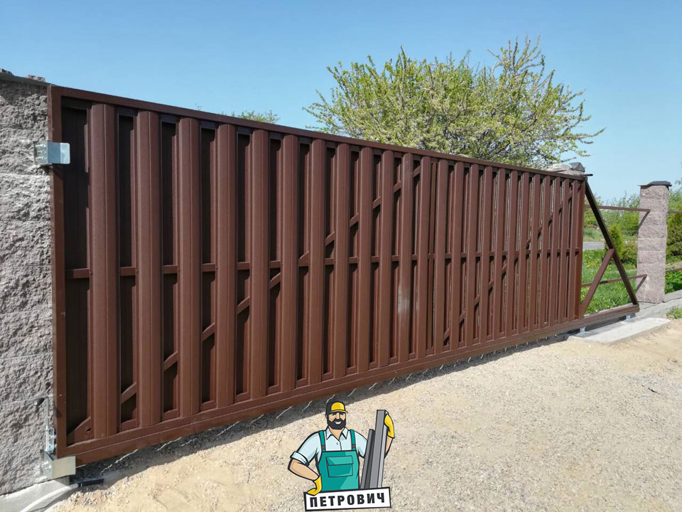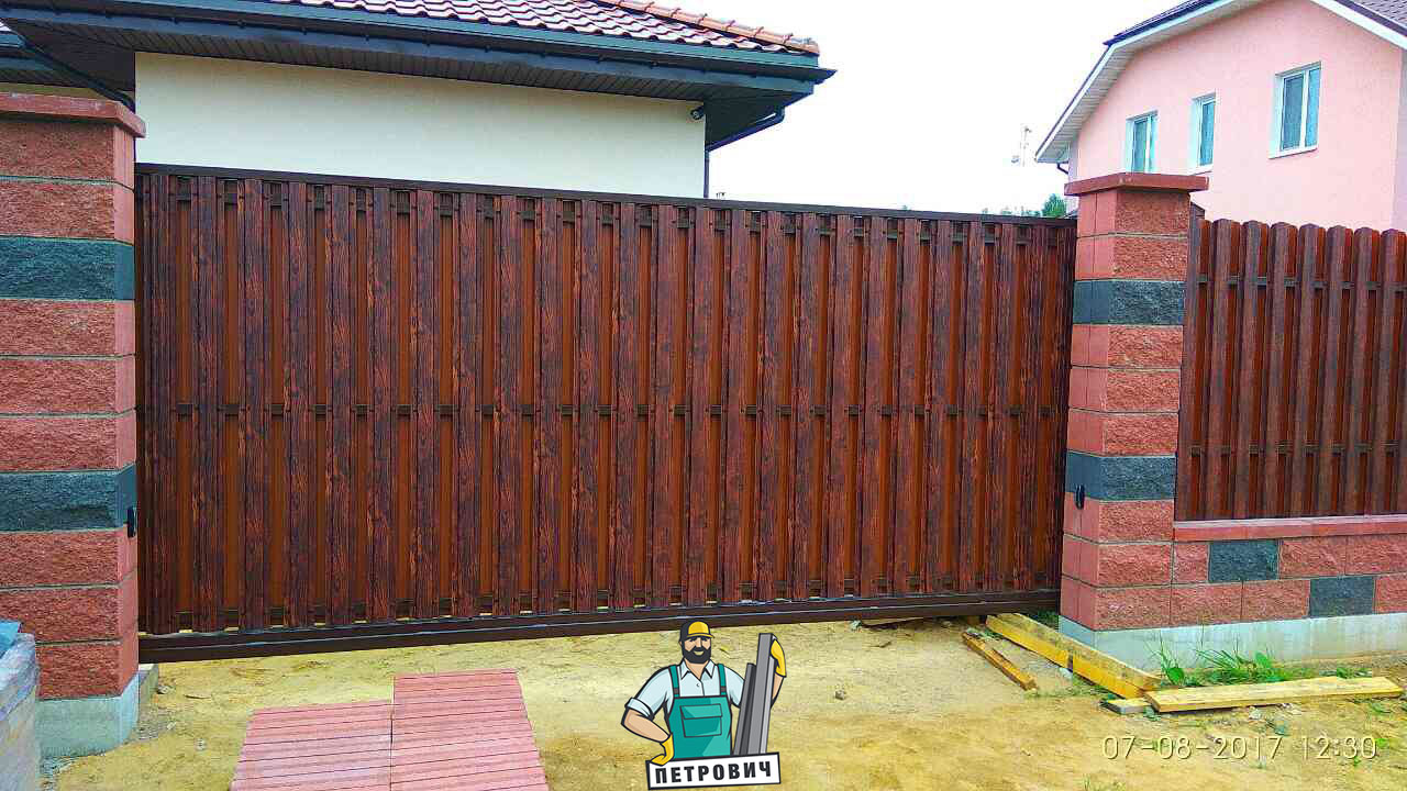 Откатные (сдвижные) ворота из металлического штакетника - интересное решение для хозяев, решивших отойти от стандартных решений при строительстве забора. Ворота могут изготавливаться как с односторонним, так и с двухсторонним заполнением. Наиболее популярными являются откатные ворота с двухсторонним заполнением