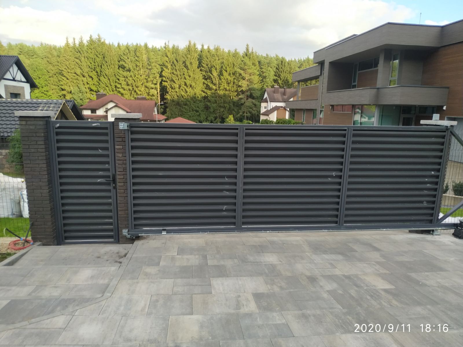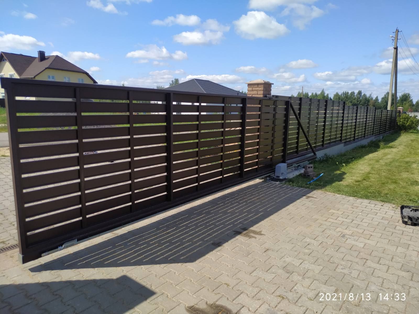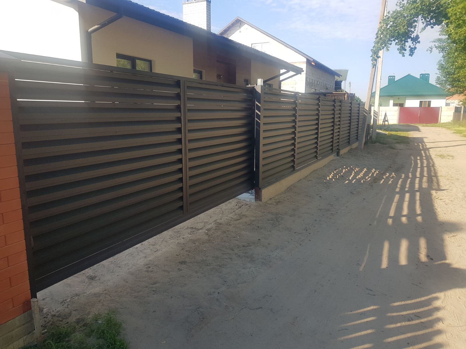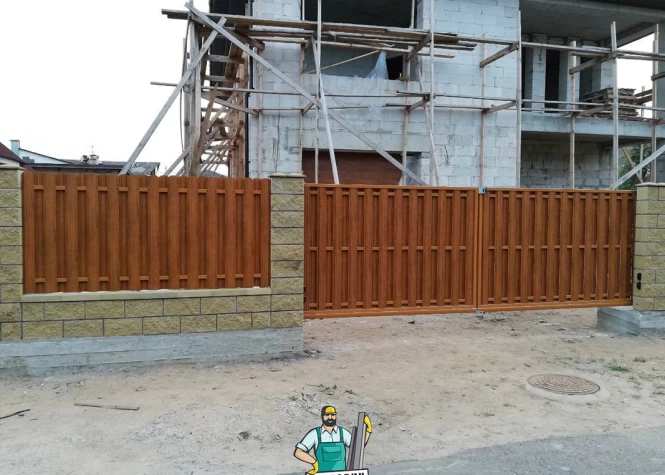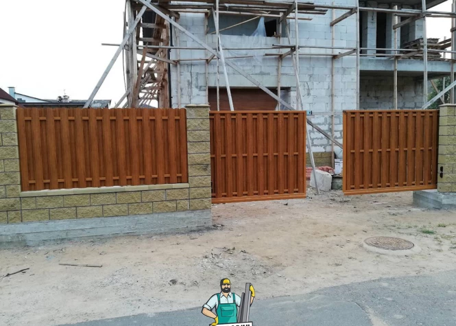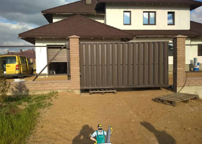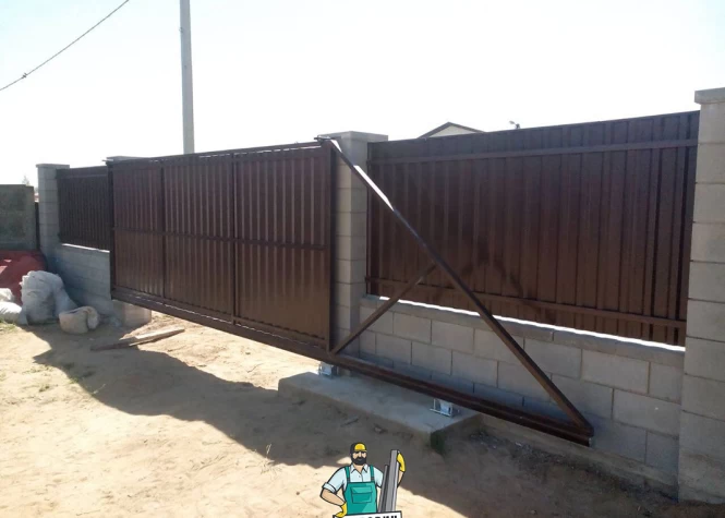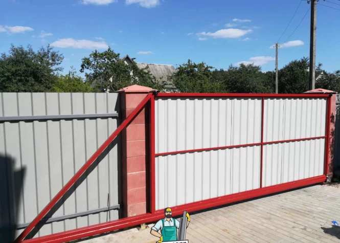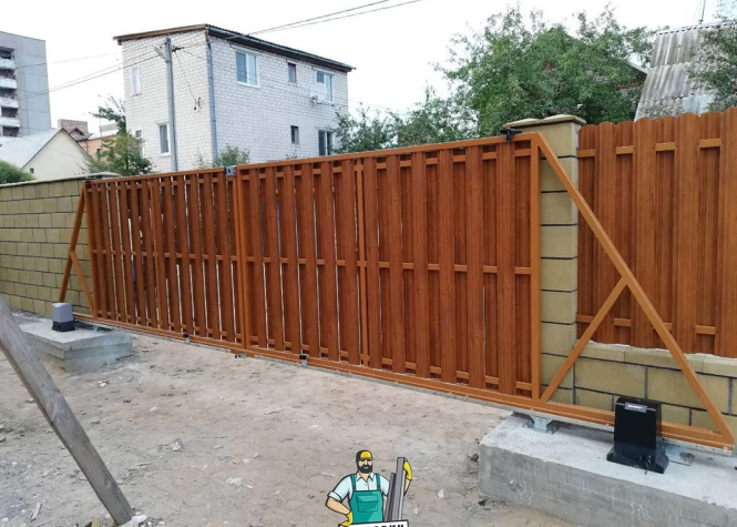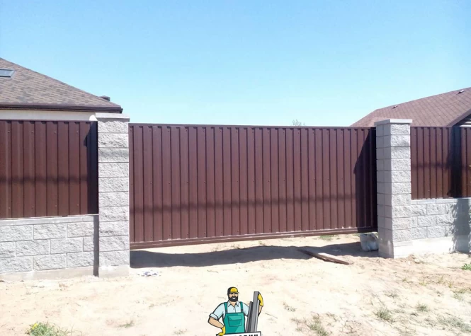 Откатные (сдвижные) ворота из металлического штакетника - интересное решение для хозяев, решивших отойти от стандартных решений при строительстве забора. Ворота могут изготавливаться как с односторонним, так и с двухсторонним заполнением. Наиболее популярными являются откатные ворота с двухсторонним заполнением