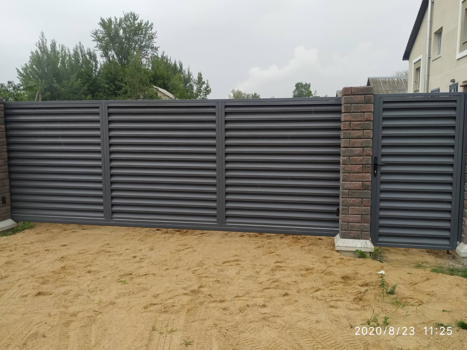 Откатные (сдвижные) ворота с калиткой внутри - интересное и необычное решение, которое мы применяем при не большой ширине проема. Ворота могут изготавливаться практически с любым заполнением по желанию заказчика. Единственным ограничением является высота ворот, которая должна быть не менее 1,9 метра. В данном случае вход в калитку будет комфортным.